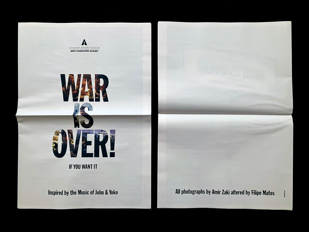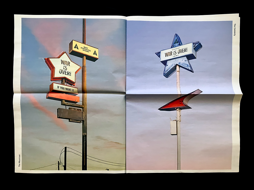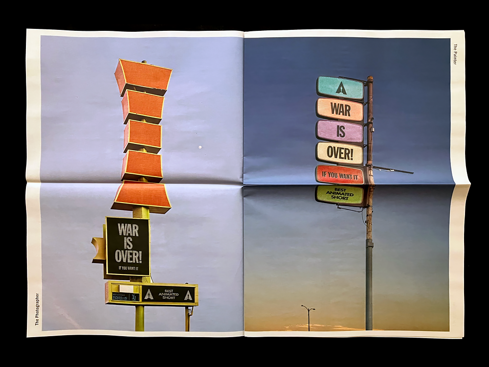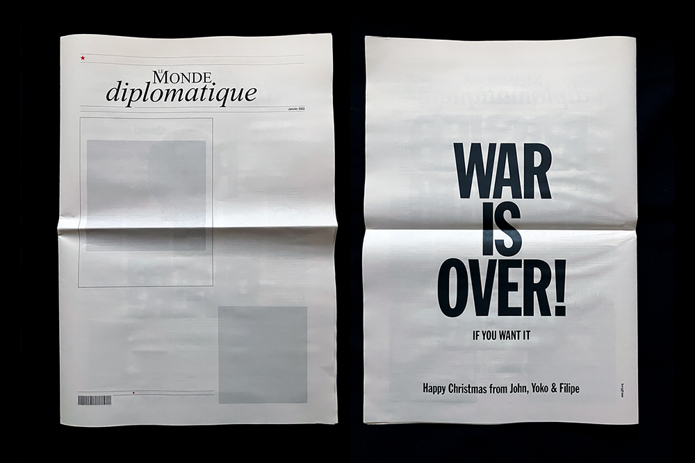 The refrain of John & Yoko's pacifist campaign, culminating in the sugary song "Happy Xmas (War Is Over)" (1971), is hijacked by the old and worn Spirit Of Past Conceptual Art. The other victim is a respectable political newspaper, rudely forced to wear the guise of a sensationalist tabloid.