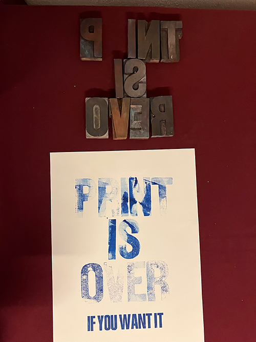 • Half a dozen poorly printed letterpress proofs, with the inscription "Print is over, if you want it";
